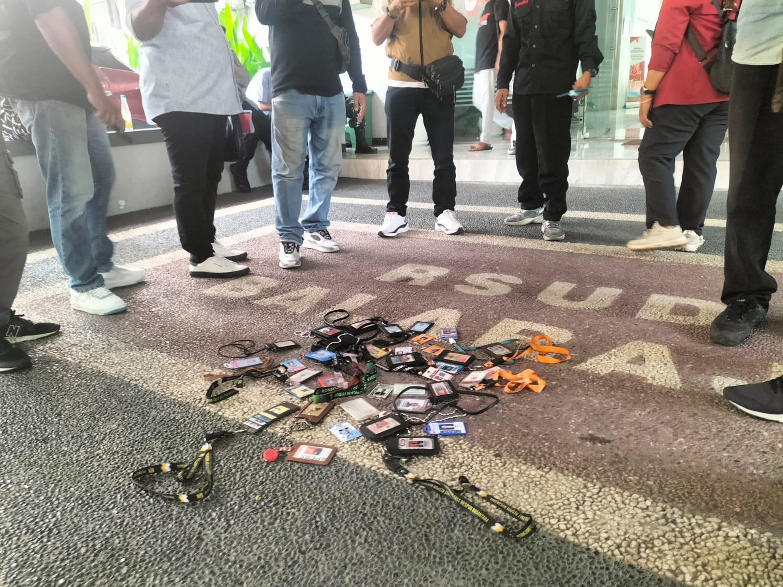 Tak puas dengan jawaban Wadirut RSUD Balaraja, spontanitas semua Wartawan yang ada di RSUD Balaraja menggelar aksi lempar KTA. Bentuk kekecewaan terhadap pernyataan yang disampaikan oleh Wadirut RSUD Balaraja Kabupaten Tangerang.