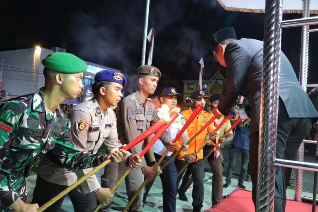 Pawai obor semakin semarak dengan penampilan drum band Muhammadiyah yang membawakan lagu-lagu perjuangan, serta pembacaan puisi teatrikal dari Jaringan Teater Riau Koorda Rokan Hilir yang mengangkat tema *Menyalakan Semangat Kemerdekaan*. Seluruh unsur Forum Koordinasi Pimpinan Daerah (Forkopimda) turut hadir dan bahkan memberikan salam hangat kepada para seniman setelah pementasan tersebut.