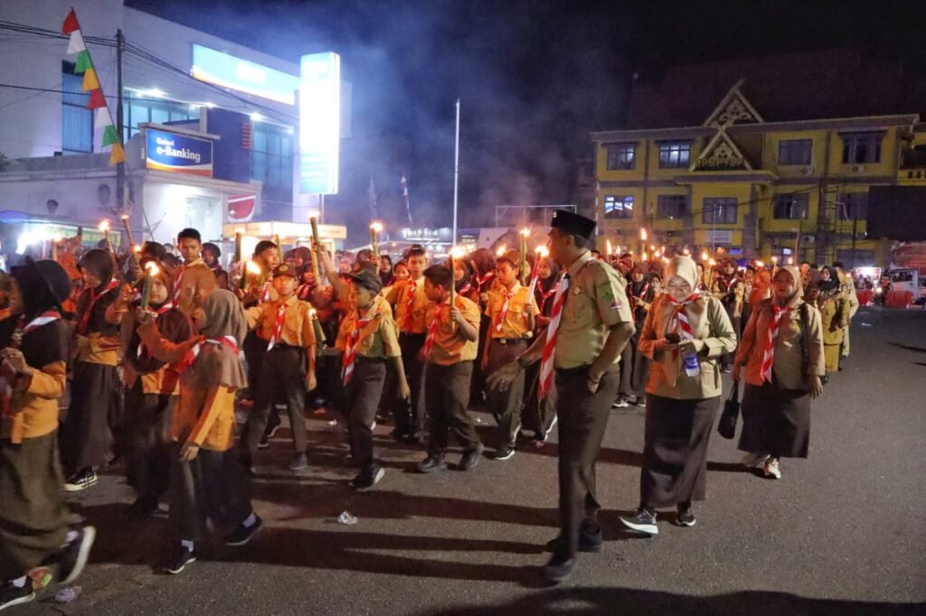 Dari pantauan, ribuan obor menyala terang di sepanjang jalan utama, berpadu dengan aroma asap yang tipis mengepul di udara malam. Barisan Pramuka dengan seragam cokelat tampak rapi, sementara dentuman drum band Muhammadiyah menggema, mengiringi langkah peserta yang berbaris sepanjang jalan Merdeka.
