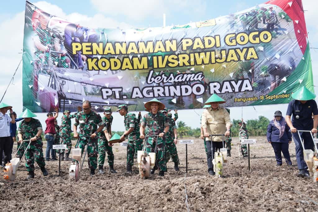 Dalam rangka mendukung ketahanan pangan nasional dan menghadapi tantangan cuaca ekstrem, Pangdam II/Sriwijaya Mayjen TNI Ujang Darwis, M.D.A., mencanangkan Program Penanaman Padi Gogo di Desa Pematang Palas, Kecamatan Banyuasin I, Kabupaten Banyuasin, Kamis (18/09/2025).