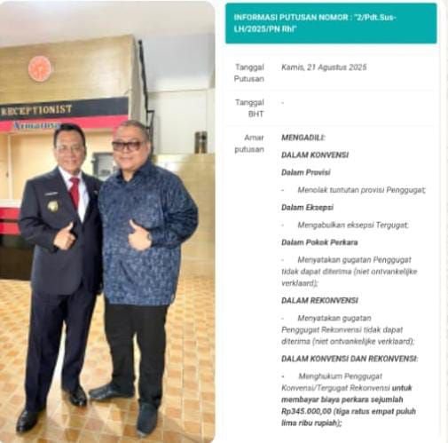 Kuasa Hukum H. Bistamam (Bupati Rohil), Cutra Andika Siregar SH MH membenarkan terkait putusan Hakim PN Rohil yang menyatakan gugatan Penggugat (Yayasan Wahana Sinergi Nusantara) terhadap kliennya tidak dapat diterima. Kata Cutra , Jum’at 22 Agustus 2025.