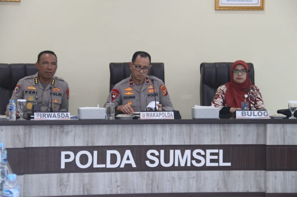 Palembang, Wakapolda Sumsel Brigjen Pol M.Zulkarnain,SIK,MSi, Irwasda Kombes Pol Feri Handoko Soenarso SH SIK bersama PJU Polda Sumsel dan Kapolres/Tabes , Kapolsek/Ta jajaran Polda Sumsel ikuti rapat secara Virtual persiapan Gerakan Pangan Murah Polri dipimpin Irwasum Polri diruang Vidcon lantai II Mapolda Sumsel Jalan Jendral Sudirman Palembang Kamis 07/08/2025 siang