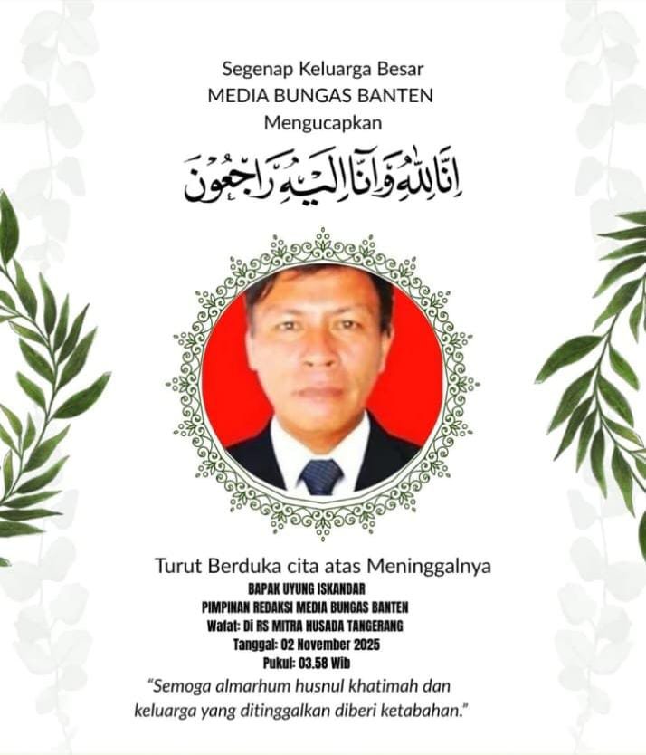 Tridayanews.id | Tangerang – Kabar duka datang dari dunia jurnalistik Banten. Pimpinan Redaksi Media Bungas Banten, Uyung Iskandar, berpulang ke rahmatullah pada Minggu (2/11/2025) pukul 03.58 WIB di Rumah Sakit Mitra Husada, Tangerang, setelah menjalani perawatan intensif.