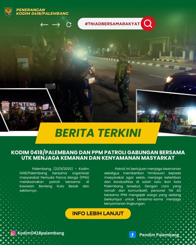 Palembang, (22/9/2025) Kodim 0418/Palembang bersama organisasi masyarakat Pemuda Panca Marga (PPM) melaksanakan patroli humanis di kawasan Benteng Kuto Besak dan sekitarnya.
