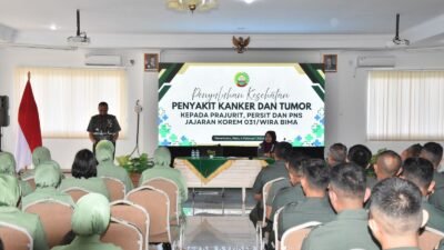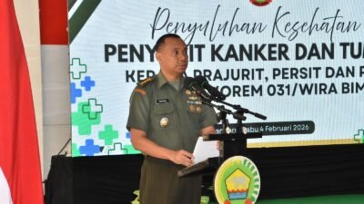 – Korem 031/Wira Bima menggelar kegiatan penyuluhan kesehatan tentang kanker dan tumor yang diselenggarakan oleh Yayasan Pemerhati Kanker Indonesia, bertempat di Aula Makorem 031/Wira Bima, Selasa (4/2/2026).