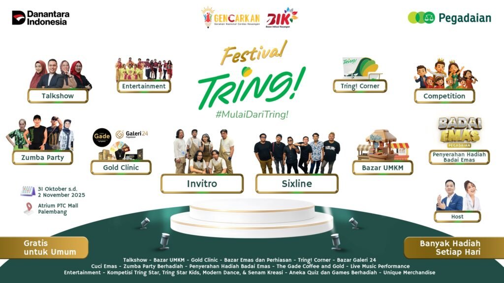 Palembang. Tridayanews.id – PT Pegadaian sambut meriah kehadiran aplikasi terbarunya Tring! by Pegadaian, dengan menggelar Festival Tring! di Kota Palembang PTC Mall Festival akbar di Sumatera Selatan akan berlangsung dari 31 Oktober hingga 02 November 2025, yang menjadi ajang perkenalan dan penanda resminya kehadiran aplikasi tersebut di tengah masyarakat SumBagSel.