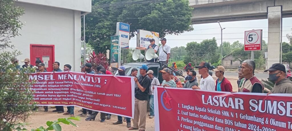 Palembang, Tridayanews.id – Laskar Sumsel (Lembaga Advokasi Sakerja Rakyat Sumatera Selatan) menggelar aksi demonstrasi sekaligus menyerahkan laporan resmi di depan kantor Kejaksaan Tinggi Sumatera Selatan (Kejati Sumsel). Laporan tersebut berkaitan dengan dugaan penyimpangan yang terjadi di SMKN 1 Gelumbang, Kabupaten Muara Enim, Sumatera Selatan, Selasa (16/09/25).