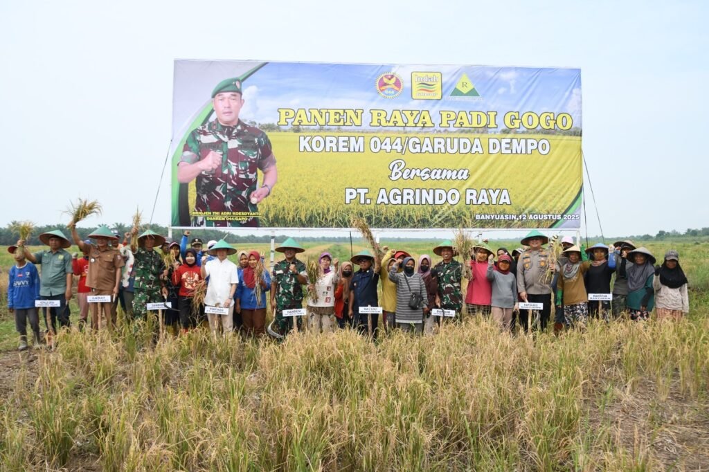 Pelembang – Danrem 044/Gapo Brigjen TNI Adri Koesdyanto menghadiri acara panen raya perdana padi gogo kerja sama Korem 044/Gapo dan PT. Agrindo Raya, bertempat di Desa Pematang Palas Kab. Banyuasin Prov. Sumsel, Selasa (12/8/2025).
