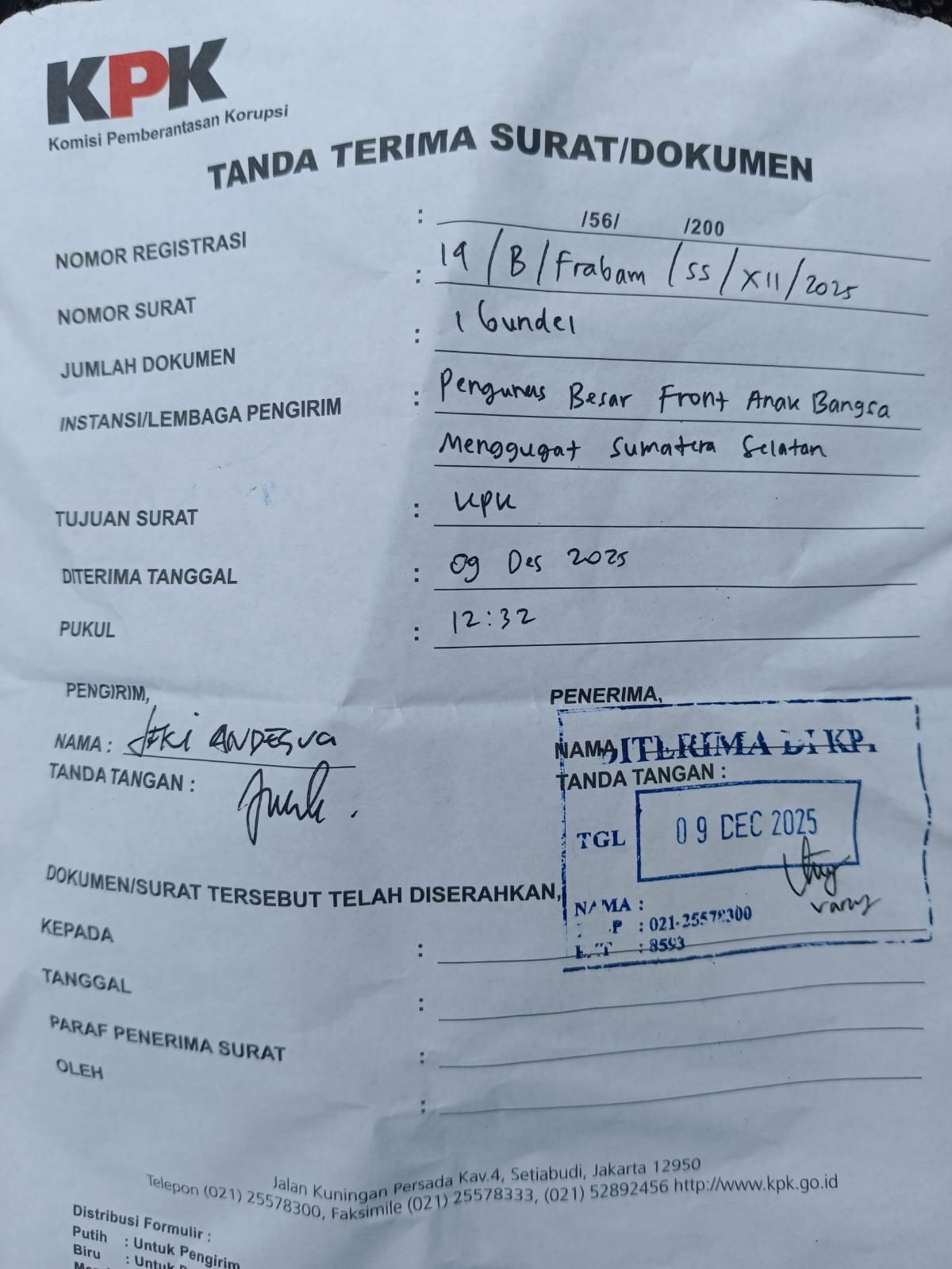 Oleh karena itu, Kami dari Pengurus Besar Front Anak Bangsa Menggugat (PB. FRABAM) Sumatera Selatan, Meminta dan Mendesak di Hari Anti Korupsi Se Dunia ini Agar Kiranya Komisi Pemberantasan Korupsi (KPK) segera memproses dan menindaklanjuti laporan kami ini serta meminta sbb ;