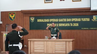 _Pomdam II/Sriwijaya menggelar Sosialisasi Operasi Penegakan Penertiban (Ops Gaktib) dan Operasi Yustisi Tahun Anggaran 2026 bertempat di Aula Mapomdam II/Sriwijaya, Palembang, Rabu (04/02/2026). Kegiatan ini dipimpin oleh Dandenpom II/4 Palembang, Letkol Cpm Daniel Yogianto, S.H., yang hadir mewakili Danpomdam II/Sriwijaya, Kolonel Cpm Dony Tri Windiarto, SH., MM._