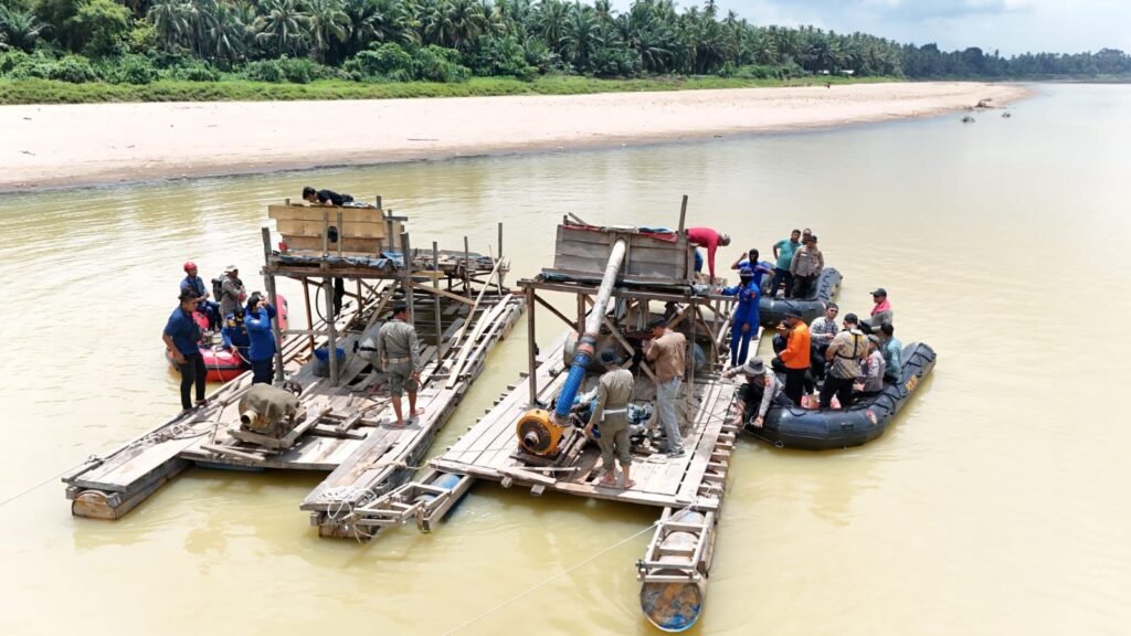 – Tim gabungan Polres Kuantan Singingi (Kuansing) bersama Satpol PP, BPBD, dan Ditpolairud Polda Riau kembali melakukan patroli serta penertiban aktivitas penambangan emas tanpa izin (PETI) di sepanjang aliran Sungai Kuantan, Kecamatan Cerenti, Kamis (4/9/2025).