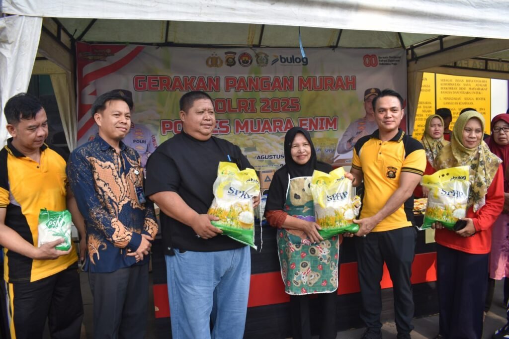 Muara Enim – Polres Muara Enim, Polda Sumatera Selatan, menggelar Gerakan Pangan Murah sebagai bentuk nyata dukungan terhadap program Presiden Republik Indonesia, Prabowo Subianto, dalam menjaga stabilitas pangan dan membantu masyarakat memperoleh kebutuhan pokok dengan harga terjangkau. Kegiatan ini dipusatkan di Lapangan Mapolres Muara Enim pada Jumat (8/8/25) dan disambut antusias oleh ratusan warga.