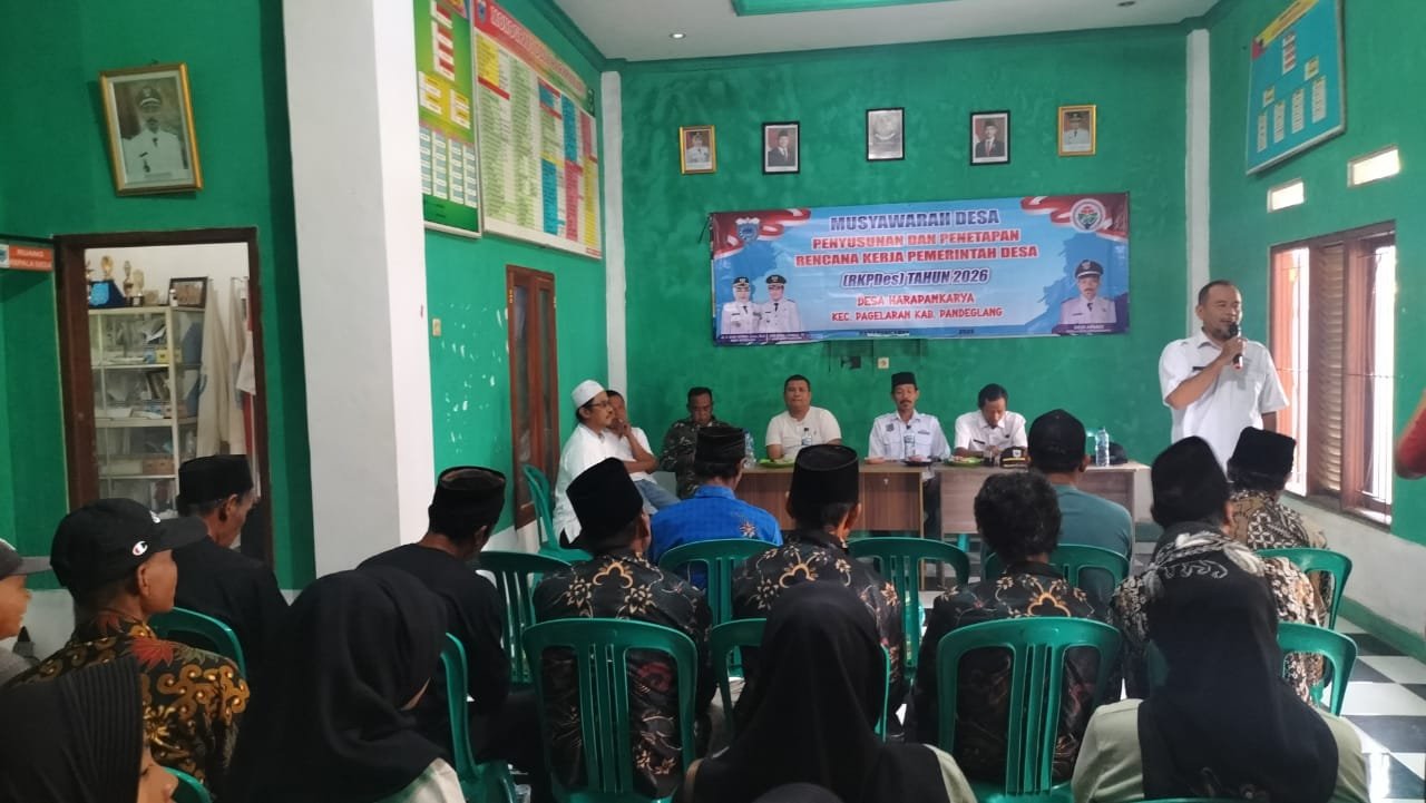 Tridayanews.id | Pandeglang – Pemerintah Desa Harapan Karya, Kecamatan Pagelaran, Kabupaten Pandeglang, Provinsi Banten, menggelar Musyawarah Desa (Musdes) dalam rangka penyusunan dan penetapan Rencana Kerja Pemerintah Desa (RKPDes) Tahun 2026, bertempat di Aula Kantor Desa Harapan Karya, Rabu (4/11/2025).