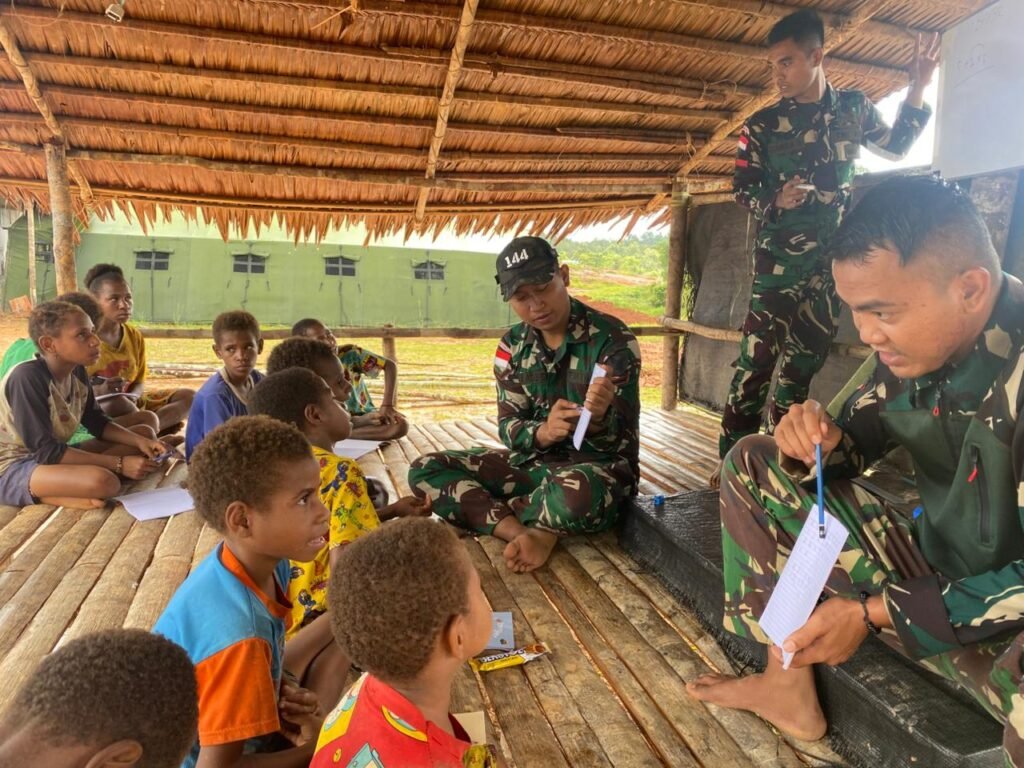 Satgas Yonif 144/JY melaksanakan kegiatan edukatif berupa belajar bersama dengan anak-anak generasi bangsa di Pos KM 60, Kampung Menewa RT 03, Distrik Sesnuk, Kabupaten Boven Digoel, Papua Selatan. Senin (04/08/2025).