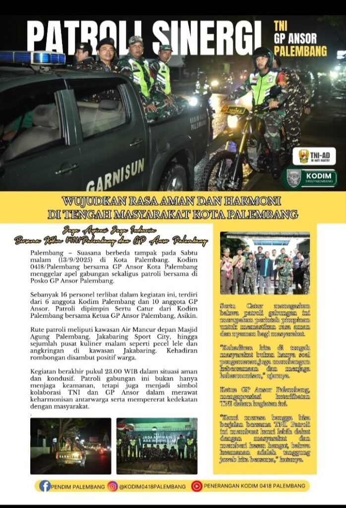 Palembang – Suasana berbeda tampak pada Sabtu malam (13/9/2025) di Kota Palembang. Kodim 0418/Palembang bersama GP Ansor Kota Palembang menggelar apel gabungan dan patroli bersama di Posko GP Ansor Palembang .