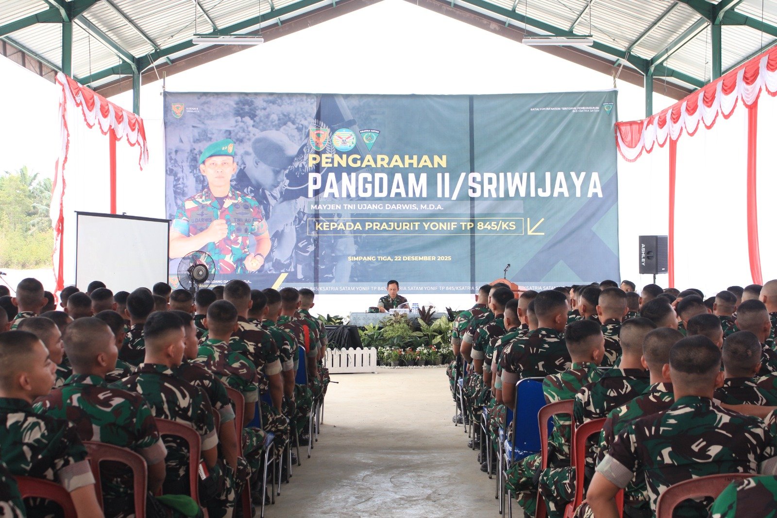 Tridayanews.id | Panglima Komando Daerah Militer (Pangdam) II/Sriwijaya, Mayjen TNI Ujang Darwis, M.D.A., didampingi Ketua Persit Kartika Chandra Kirana Daerah II/Sriwijaya Ny. Desi Ujang Darwis, melaksanakan kunjungan kerja ke Batalyon Infanteri Teritorial Pembangunan 845/Ksatria Satam yang berlokasi di Simpang Tiga, Kecamatan Simpang Renggiang, Kabupaten Belitung Timur, Provinsi Kepulauan Bangka Belitung, Senin (22/12/2025). Kunjungan kerja tersebut bertujuan untuk memberikan motivasi, arahan, serta pembinaan kepada para prajurit Yonif TP 845/Ksatria Satam.
