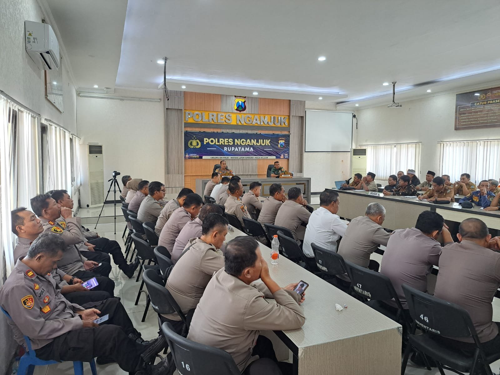Wakapolres Nganjuk KOMPOL Andria Diana Putra, S.E., M.H., yang memimpin rakor mewakili Kapolres Nganjuk AKBP Henri Noveri Santoso, S.H., S.I.K., M.M., menegaskan pentingnya antisipasi bersama terhadap potensi gangguan kamtibmas selama proses pengesahan berlangsung.