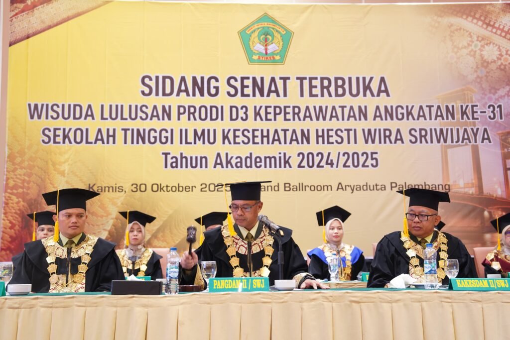 Kapoksahli Pangdam II/Sriwijaya Brigjen TNI Junaidi M., S.Sos., M.Si., mewakili Pangdam II/Sriwijaya Mayjen TNI Ujang Darwis, M.D.A., menghadiri Sidang Senat Terbuka dalam rangka Wisuda Program Studi D-III Keperawatan Angkatan XXXI Tahun Akademik 2024/2025 STIKES Hesti Wira Sriwijaya, Kamis (30/10/2025) bertempat di Ballroom Hotel Aryaduta, Jalan POM IX, Lorok Pakjo, Kecamatan Ilir Barat I, Kota Palembang.